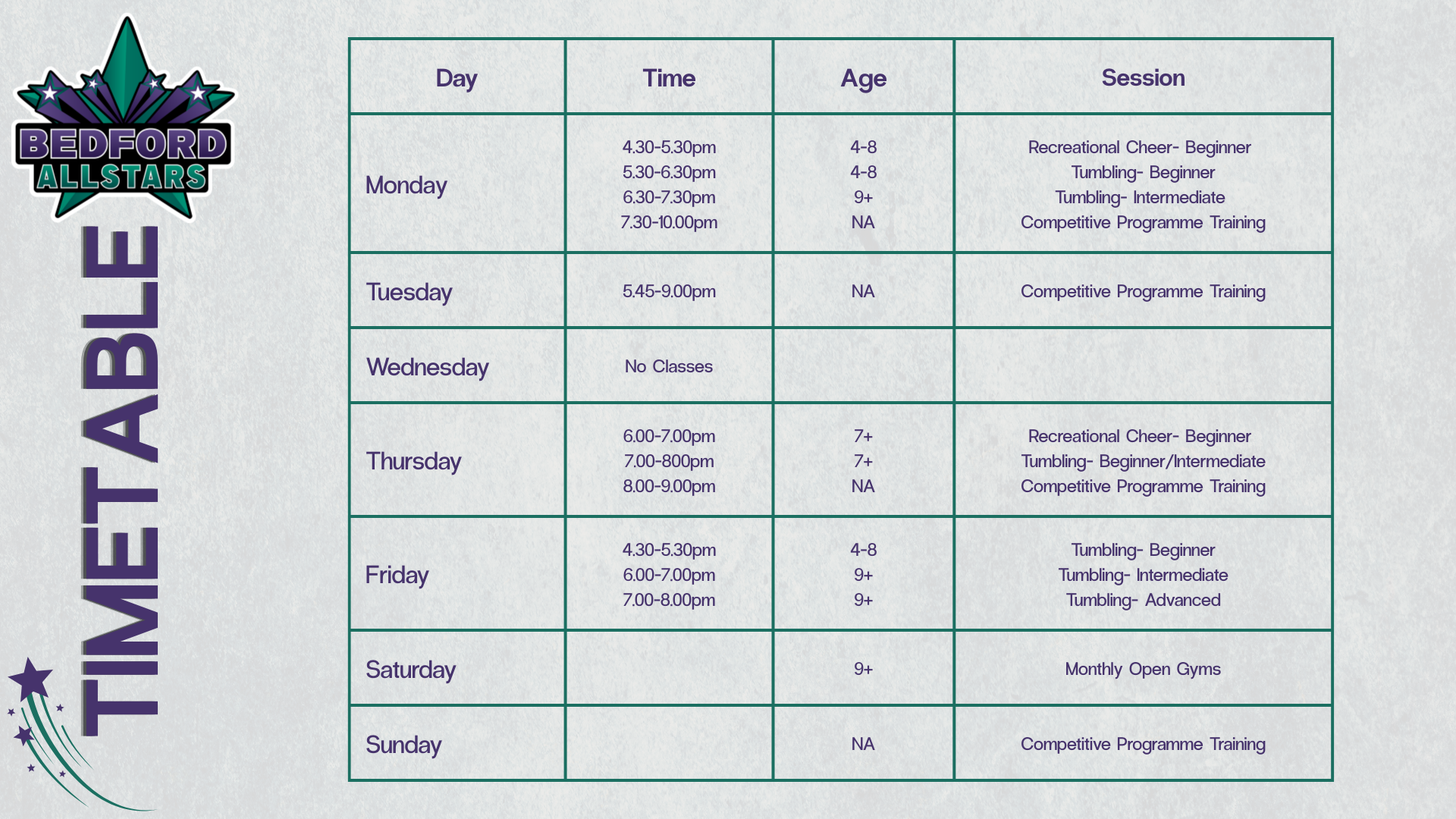 Class times are an hour long and we offer all new members a free trial, to assess which class is appropriate. Our tumbling classes cater for children aged 4 and above. Class times can be found in the timetable below.